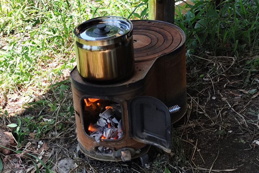 庭の薪ストーブでも調理できます ハンモックであそんだり、クジラの彫刻にまたがったり